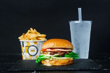 Charbroiled 100% Angus Beef (no additives, fillers or preservatives) melted American Cheese, lettuce, tomato, red onions, pickles, and PotatoGuys™ sauce, served on a toasted, buttery bun